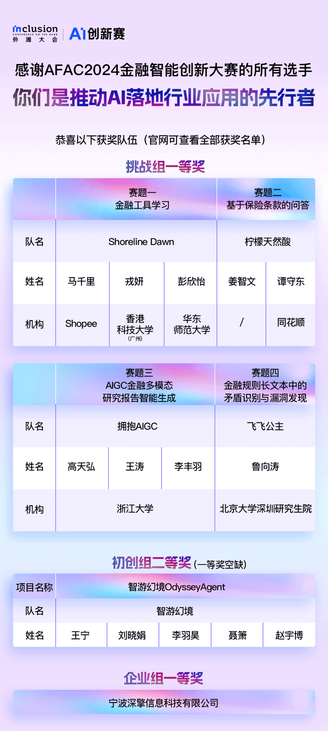 AFAC赛设挑战组、初创组、企业组三个组别,挑战组面向开发者,选手将基于大赛提供的金融科技领域真实数据,解决业务场景问题。初创组面向创业团队或种子企业,面向金融、科技、生活等场景开发示例应用,设计商业方案。企业组面向金融科技行业的中小微企业,选手将着眼于金融科技行业的新兴方向,提报有亮点、有新意的新技术、新产品落地项目。赛事成果涵盖医疗健康、金融科技、智能制造等多个热点领域,体现了AI技术的广泛应用潜力,让AI不仅于“CHAT”(聊天),走入实际应用“ACT”(服务)。