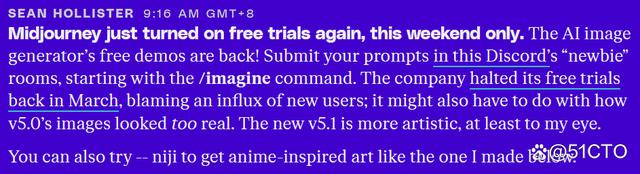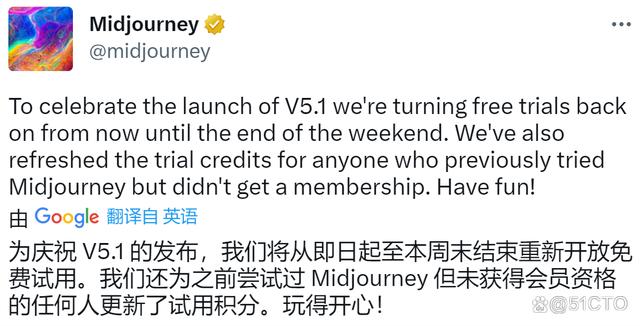为了纪念V5.1版本的问世,Midjourney于昨日透過Twitter宣布了一项重要消息。该公司决定从即日起直至本周末,重新开放免费试用服务,并免费更新了试用积分,以吸引广大会员和非会员账号的用户的关注。这一举措无疑将进一步提升Midjourney产品的用户体验,并为潜在用户提供了一个了解产品的好机会。