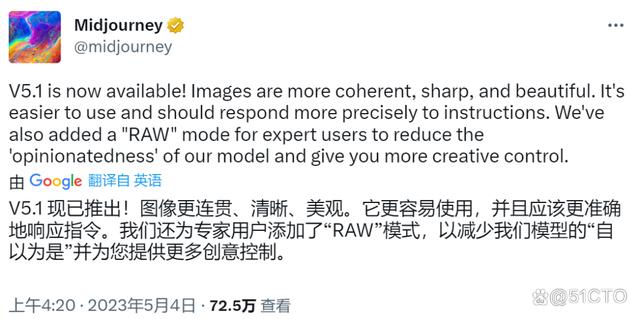 据悉,Midjourney是在5月2日新上线的V5.1版本…