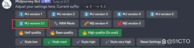 最新Midjourney 5.1版本目前还在测试中,就如前文所说,用户可以在Discord上输入/settings命令默认使用。