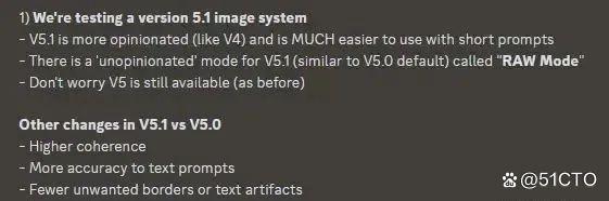 V5.1版本相较于V5.0版本,在易用性、支持的prompt复杂度、生成的图像创意程度以及图像清晰度等方面都有所提升。更为引人注目的是,Midjourney生成的图像在“主见”方面也展现出了更大的进步。