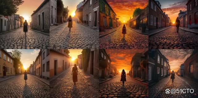 首先,输入了prompt:“女人走在鹅卵石街道上,走向日落”,生成了第一张图像: