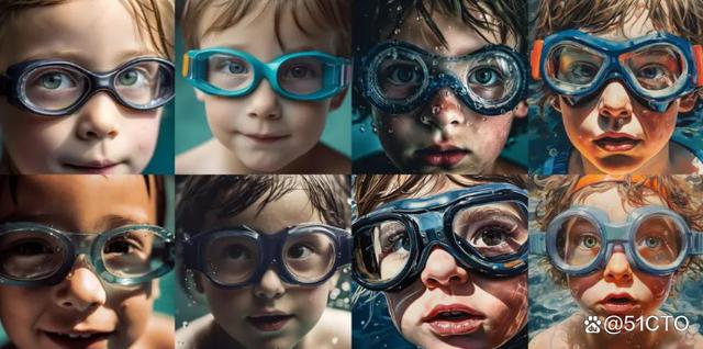 生成人脸图像是Midjourney所擅长的,第三张图片的prompt是“戴着泳镜的孩子”: