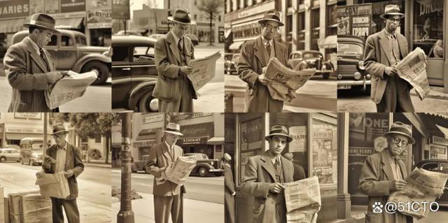 最后,外媒测试了一下5.1版本是否真的减少了文字失真的问题,prompt如下:“街角卖报纸的人,1950年代风格,棕褐色。”