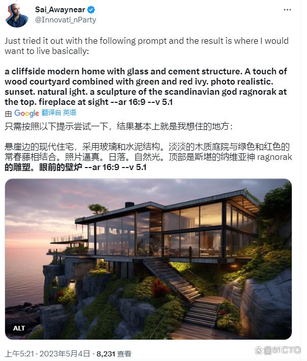 在尝试过5.1版本过后,一位名为Sai_Awaynear的用户生成了理想住宅的照片,从生成的图像中我们不难看出,新版本能够根据用户意愿生成“悬崖边的现代住宅”。