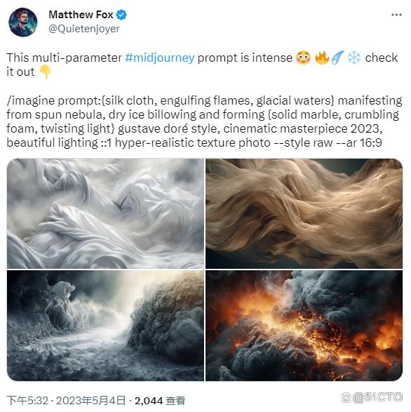 另一位名为Matthew Fox用户在输入prompt“丝绸布,吞没的火焰,冰川水”以后生成了上图。