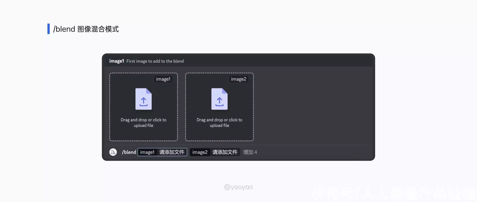 /blend 混合模式,该指令允许你上传2-5张图片,然后将这些图片合成新的图片效果。