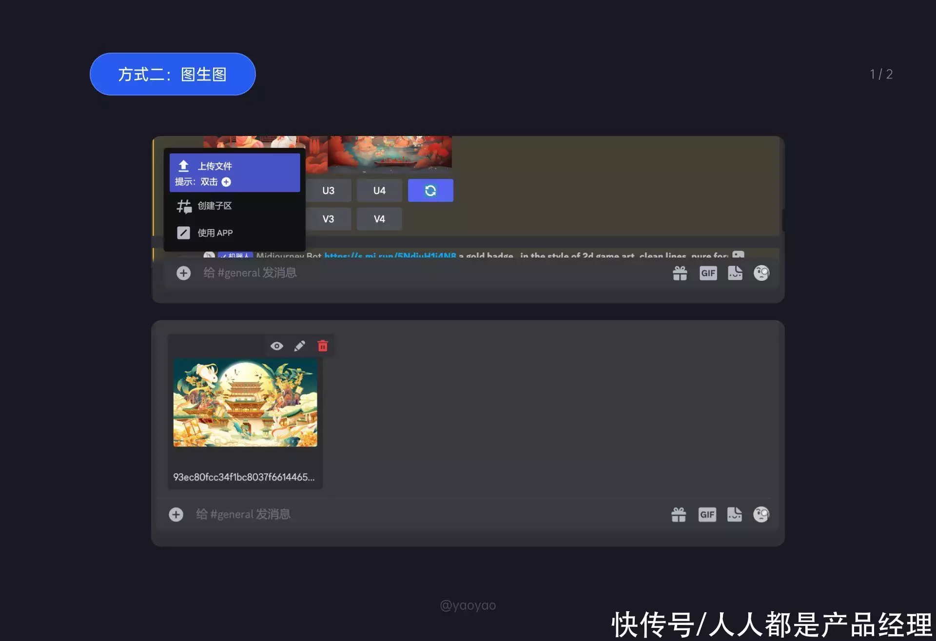 点击上传图片,然后 MidJourney 会自动分析图片的内容,生成 4 条适合的 Prompt,可以在这些 Prompt 的基础上添加自己的创意想法,创造出更有趣的设计。这个功能是4月初上线的,简直好评如潮,不用花费太多时间去构思 Prompts,一键生成满意的图片。