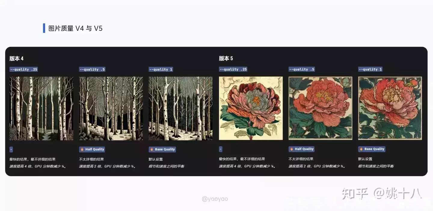 第一行:版本号 MJ version 1, 2, 3, 4, 5 是生成图片版本,最新的是v5,分辨率更高,理解力更强,细节处理更好,强烈推荐;