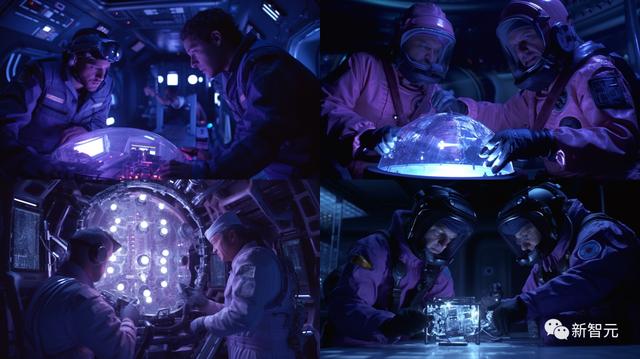 「2000s sci-fi film still, medium full shot, two-shot of 2 astronauts opening a strange artifact, blue & purple tones, atmospheric lighting, dramatic light and shadow contrast, screens with spaceship ui/ux, clues, discover, suspenseful –ar 16:9 –style raw」
