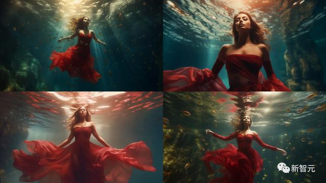 prompt:「A woman in a red dress is facing you, Underwater photo, hyper photo realistic, enchanted environment, cinematic, 4k, Epic, –ar 16:9 –v 5.1 –v 5.1 」