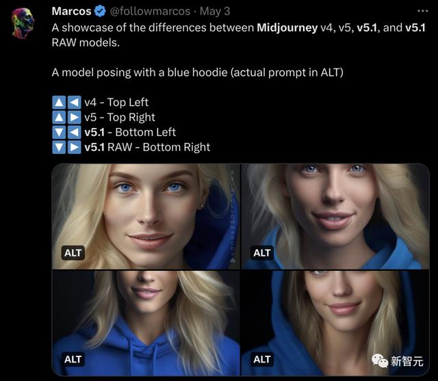 网友展示了Midjourney v4、v5、v5.1、v5.1的RAW model的差异。