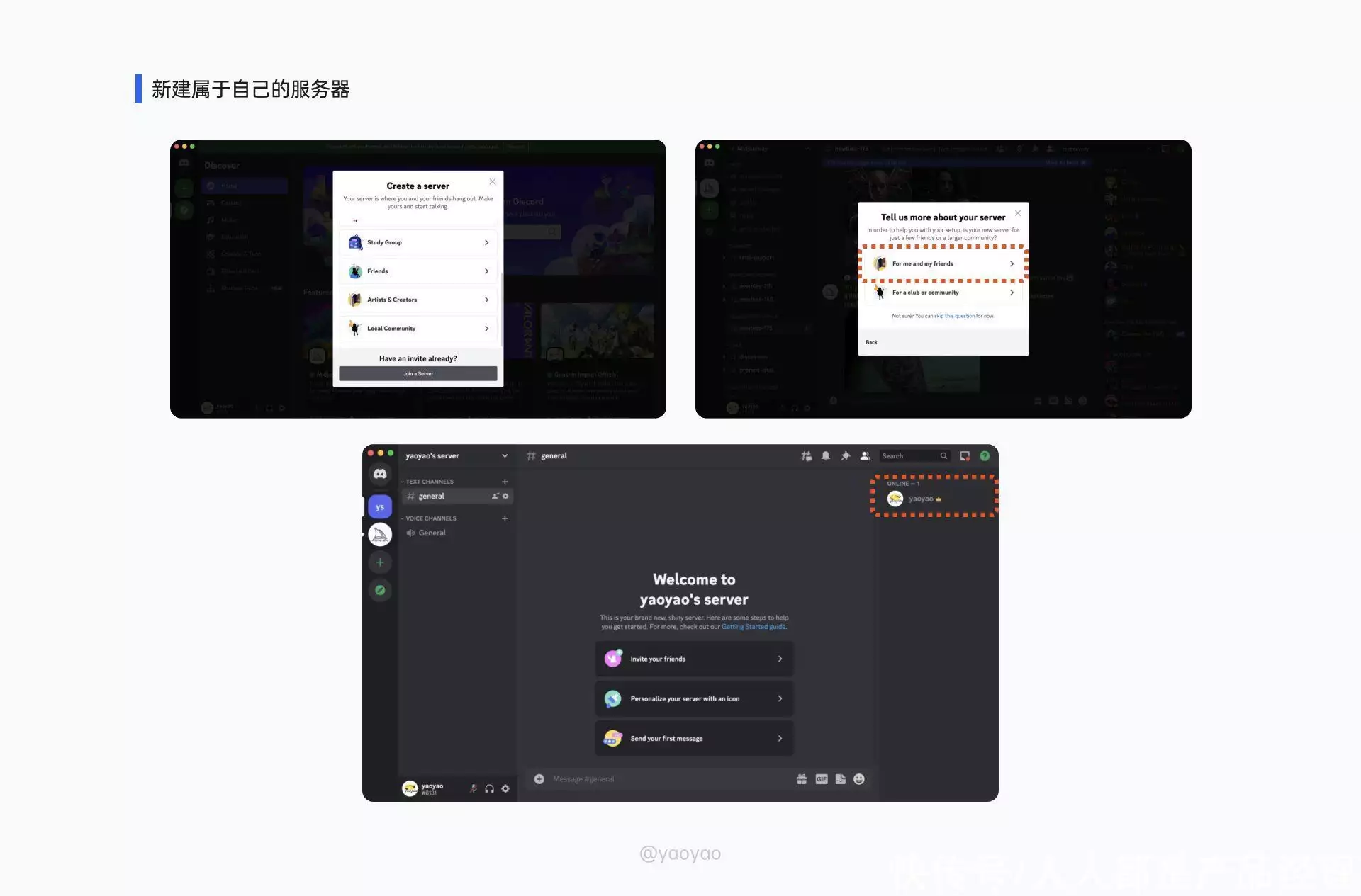 创建服务器的窗口,首先选择“亲自创建”,然后选择“仅供我和朋友使用”,最后创建服务器名称,填写完成之后进入属于自己的服务器。