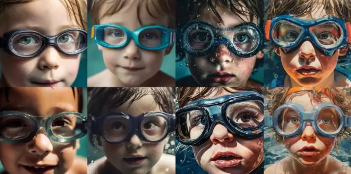 人脸是 Midjourney 的一个强项,下一张图片的提示词是“戴着泳镜的孩子的特写”: