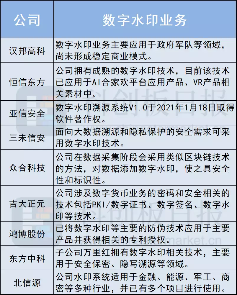 随着由AIGC生成的内容越来越多,数字水印的重要性也将进一步提高。据《科创板日报》不完全梳理,这些A股公司表示拥有数字水印技术: