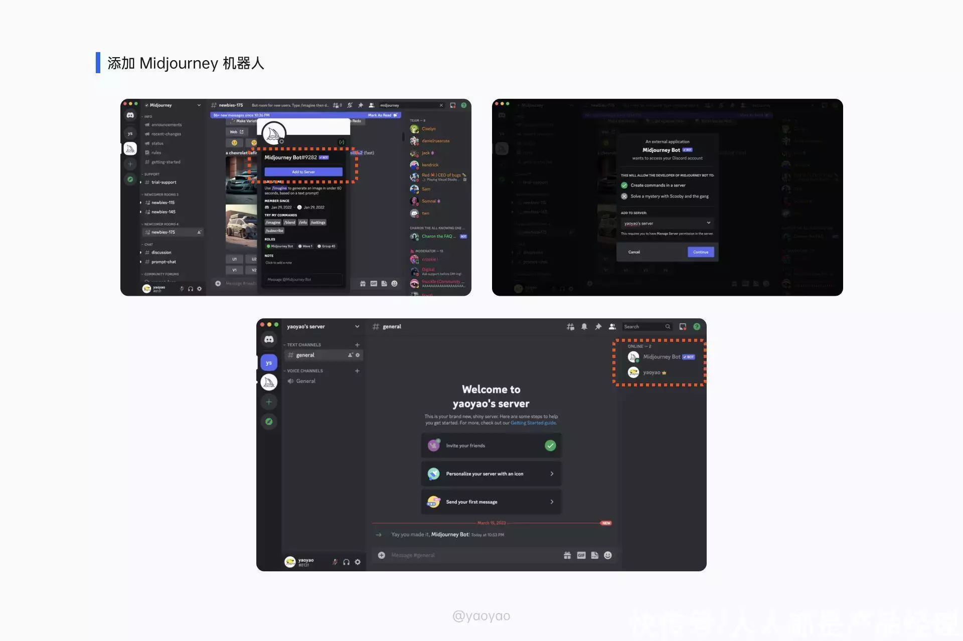 在频道中点击右边顶部的“成员”图标,点击“Midjourney Bot”,弹窗中点击“Add to Server”(添加到服务器)。选择刚才自己创建的服务器,这样就可以把最重要的机器人邀请到自己的服务器中了。在成员列表里,可以看到“Midjourney Bot”和自己。至此,所有的准备工作就完成啦!