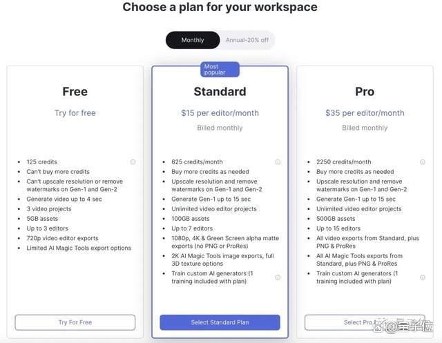 额度用完或者你想体验去水印、提升分辨率等额外功能,就需要买会员,标准版为15美元一个月,Pro版35美元,年付更便宜一些。