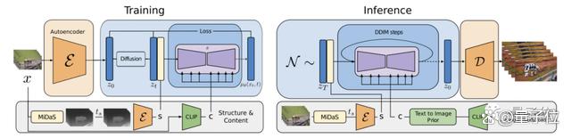 然后对MiDaS获得的深度图进行编码,提取出结构表示s;再用CLIP对其中一个帧进行编码来获取内容表示c。