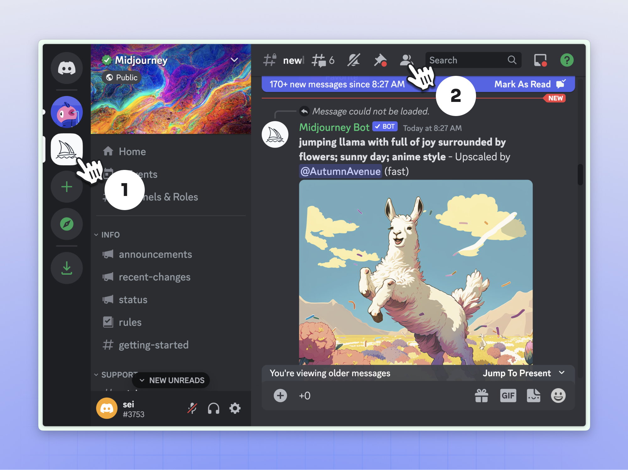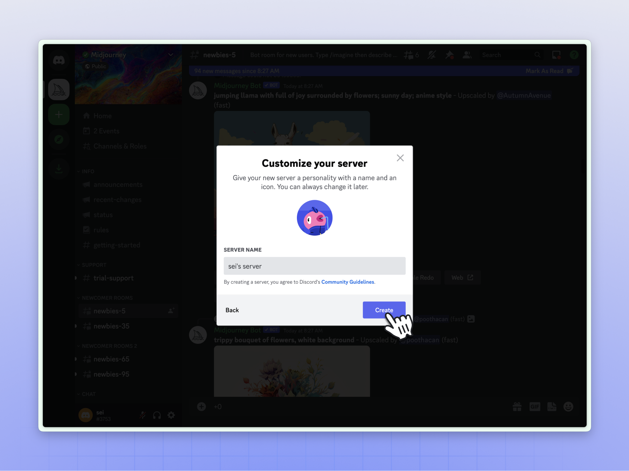前面介绍 MJ 基本使用方式时讲过,若你嫌在公共社区创作太闹心,可以在 Discord 里添加自己的服务器,再邀请 MJ 机器人进来就行了,下面根据图示操作即可。