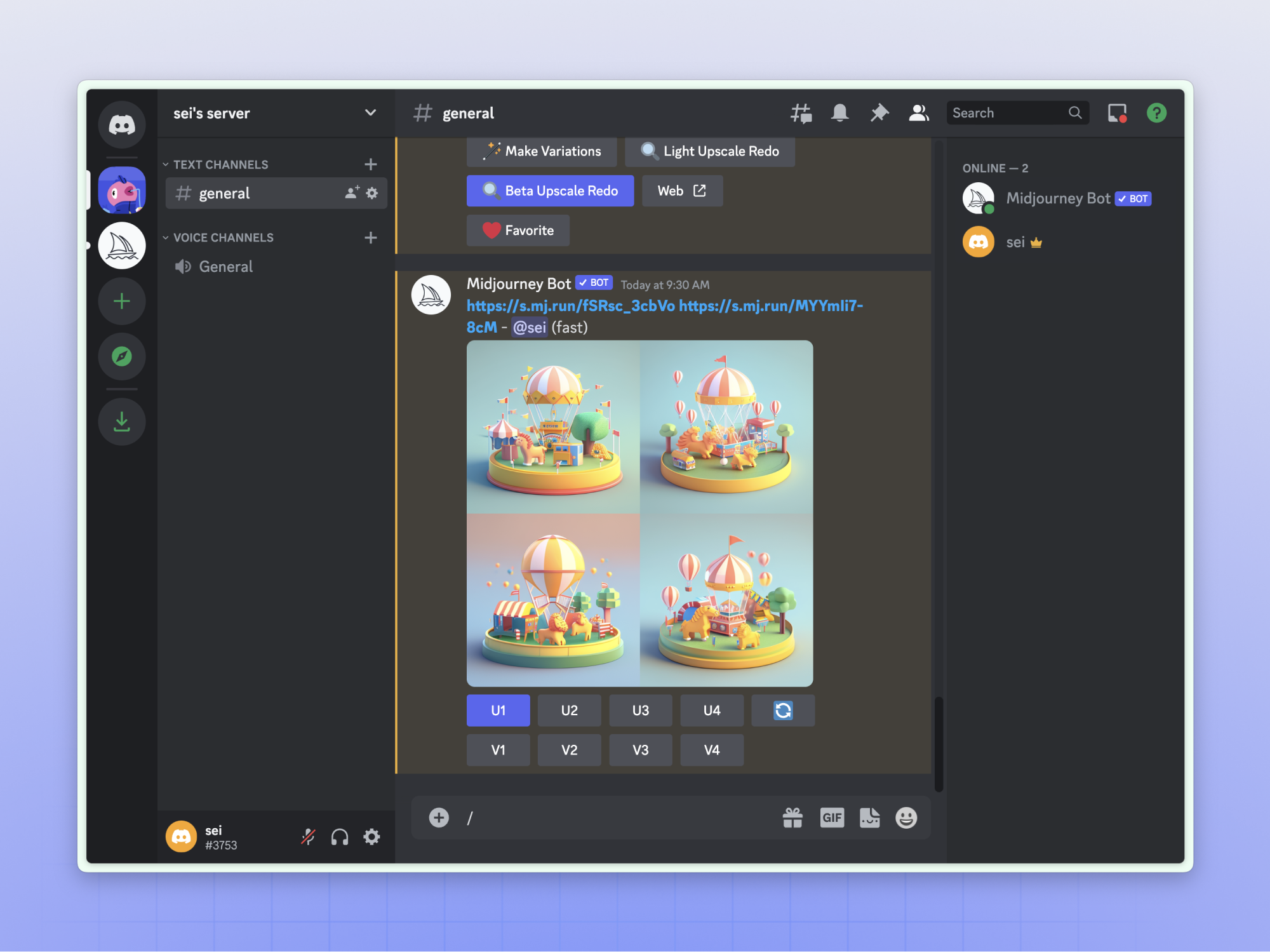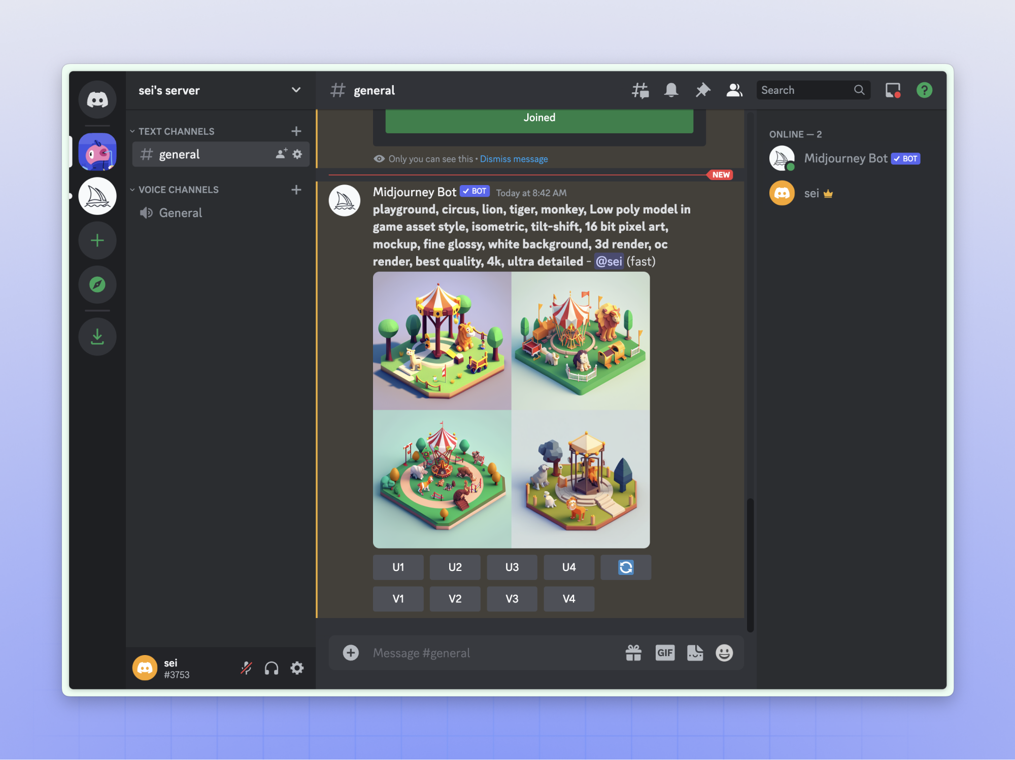 当然如果觉得公共区太乱,也可以在 Discord 上单独开通服务器,邀请 MJ 机器人入驻你的个人服务器,在里面单独做画,也可以邀请好友一起来。理论上所有通过 MJ 进行的创作都会被公开,如果想设置私密模式那就需要氪金。