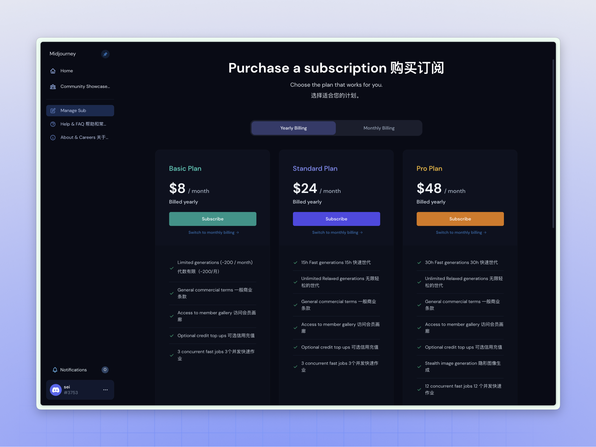 MJ 目前有三档付费订阅方案,之前是可以用支付宝支付的,后来出现 bug 给取消了。目前支持银联信用卡支付,可以选择按年支付也可以选择按月,月付会更贵一些。