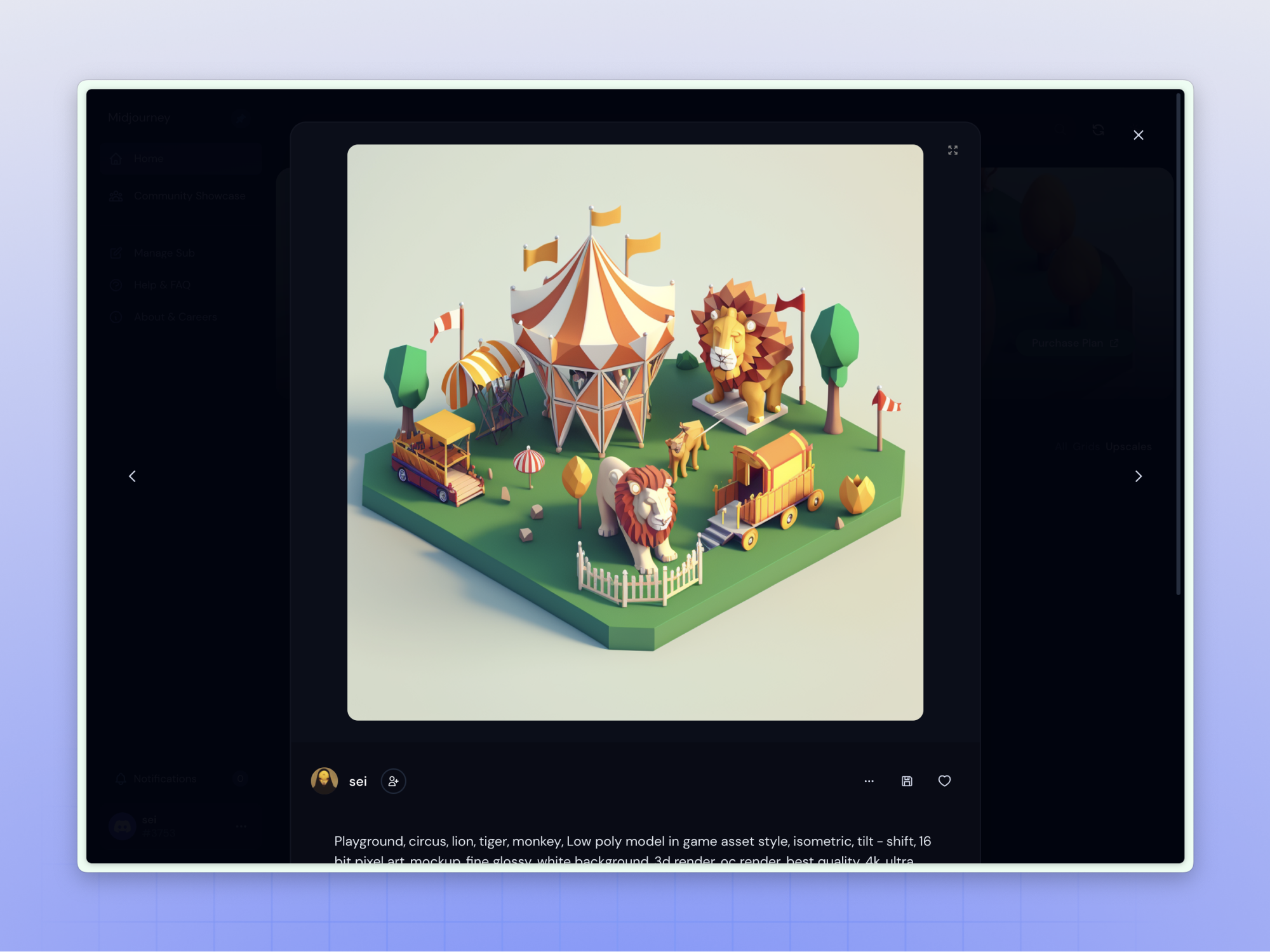 这里我们可以用月维 @四喜茶茶 分享的提示词试一下马戏团风格的等轴 3D 模型插画。(推荐关注其 B站 账号,一位声音很好听的妹纸,在持续更新各种绘图风格实用小教程。)