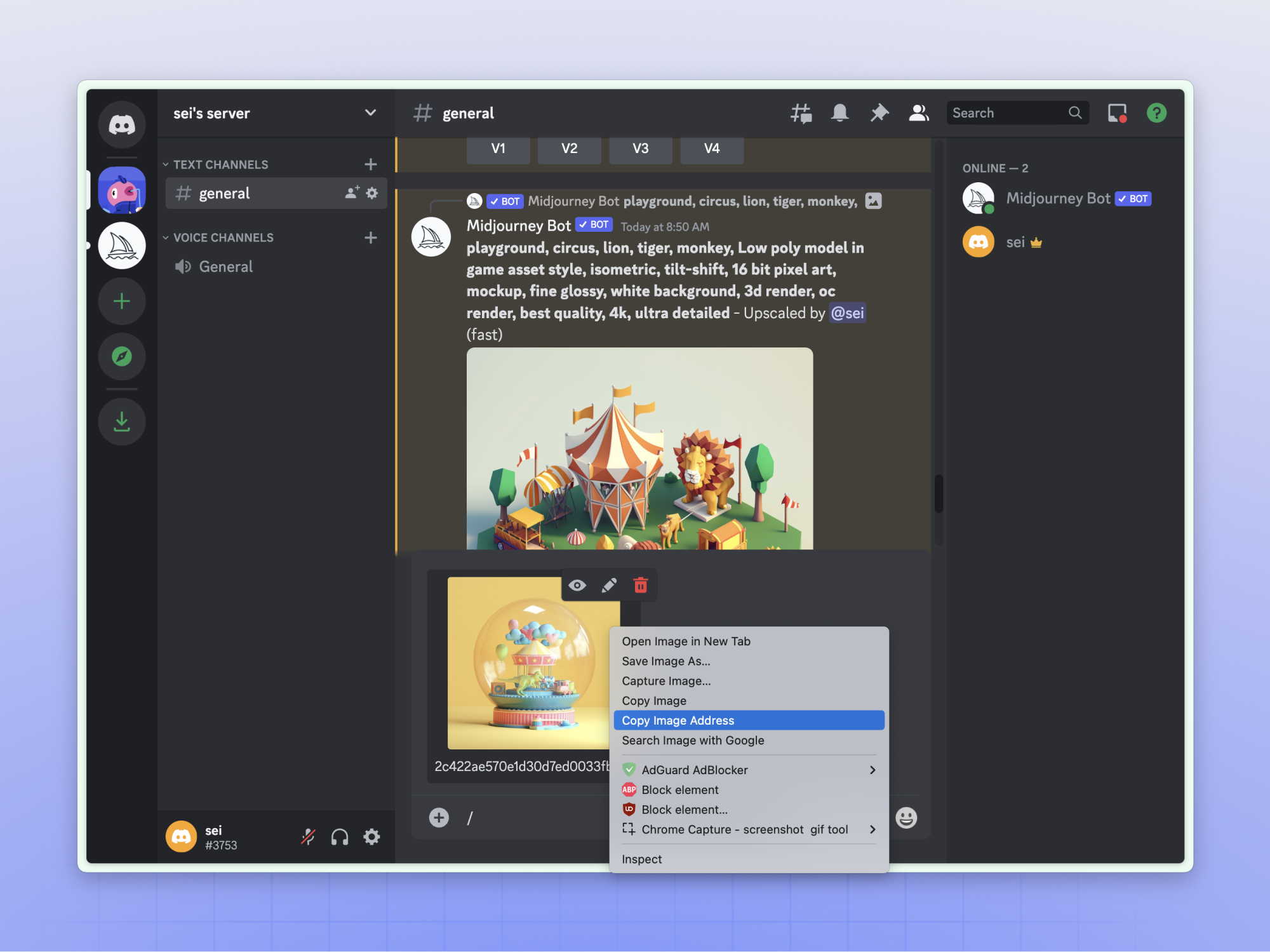 具体操作也非常简单,Discord 社区是完全公开的,只要 @机器人,输入“/image ” 指令即可使用 MJ 绘图,绘制完成的图片和提示词会直接显示在公共社群里。