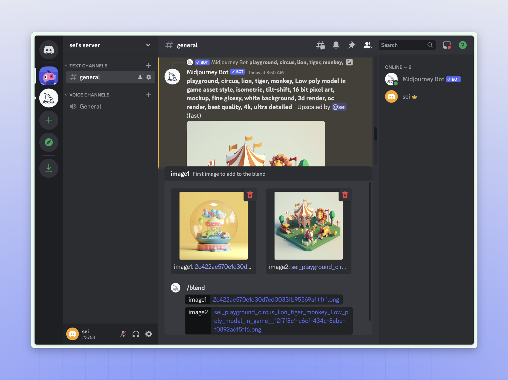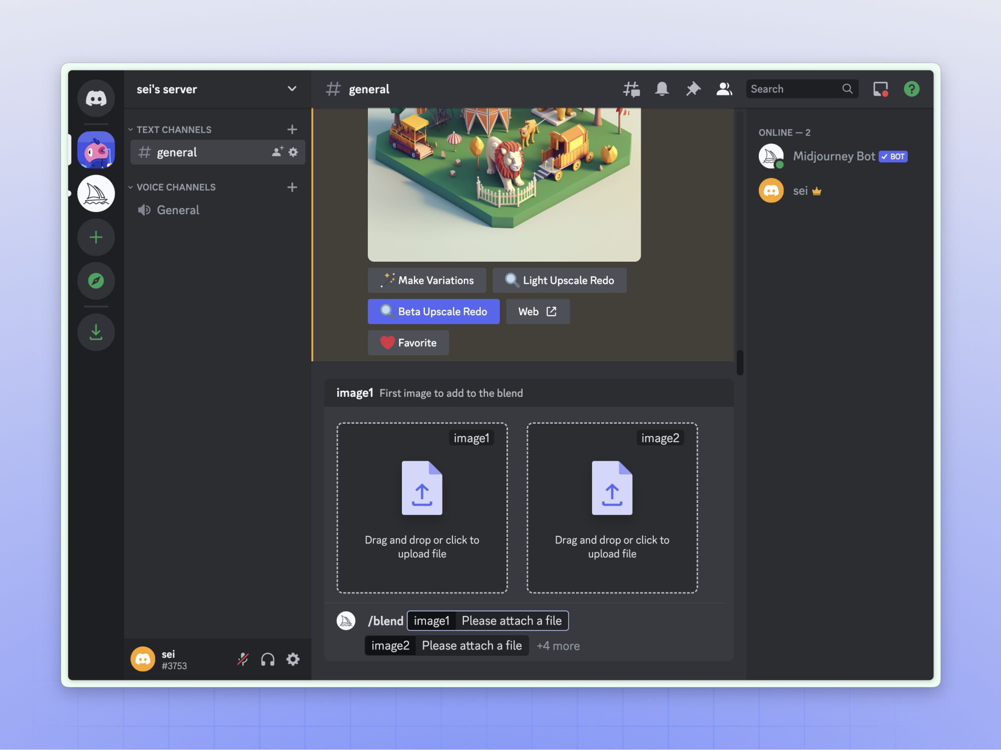 还可以通过输入“/blend”指令来实现融图,就是上传两张图片来达到一个杂糅再创作的效果。