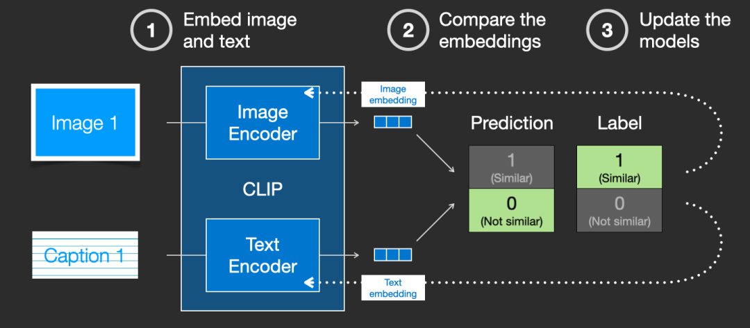 数据集通过从网上抓取的图片以及相应的「alt」标签文本来收集的。CLIP 是图像编码器和文本编码器的组合,其训练过程可以简化为拍摄图像和文字说明,使用两个编码器对数据分别进行编码。