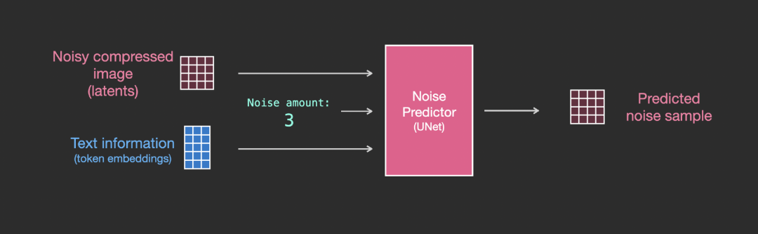 扩散是在下图中粉红色的图像信息创建器组件中发生的过程,过程中包含表征输入文本的token嵌入,和随机的初始图像信息矩阵(也称之为latents),该过程会还需要用到图像解码器来绘制最终图像的信息矩阵。