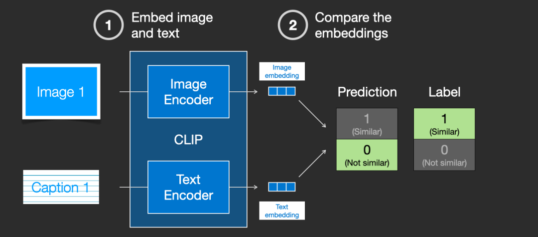 通过在整个数据集中重复该过程,并使用大batch size的编码器,最终能够生成一个嵌入向量,其中狗的图像和句子「一条狗的图片」之间是相似的。就像在 word2vec 中一样,训练过程也需要包括不匹配的图片和说明的负样本,模型需要给它们分配较低的相似度分数。