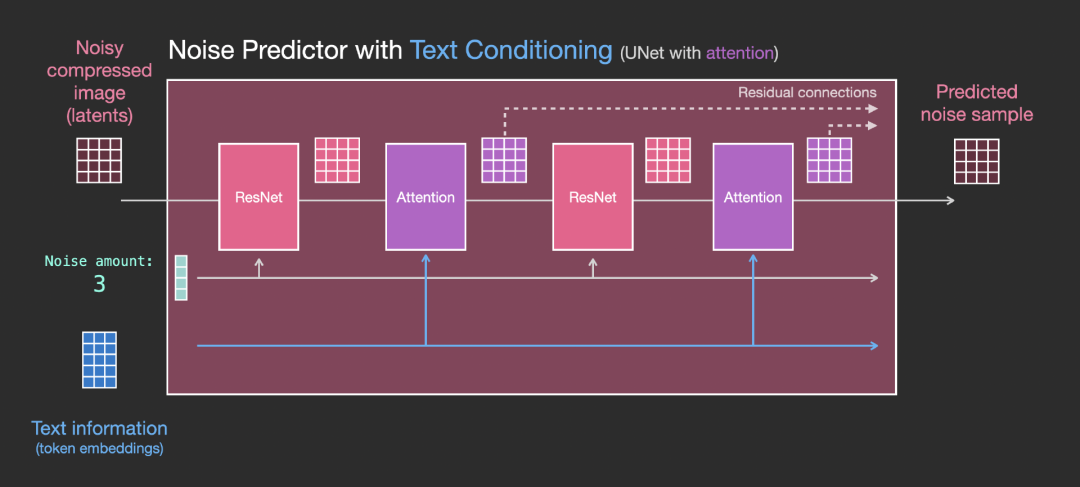 需要注意的是,ResNet块没有直接看到文本内容,而是通过注意力层将文本在latents中的表征合并起来,然后下一个ResNet就可以在这一过程中利用上文本信息。