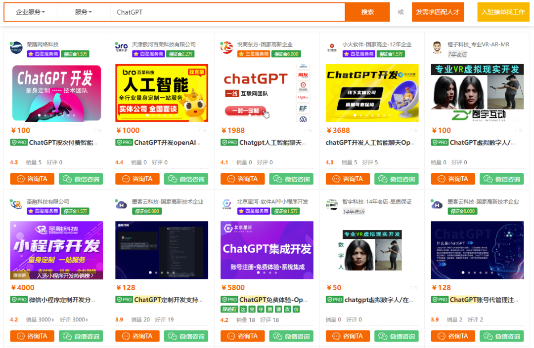 在猪八戒网上以ChatGPT为关键词进行搜索,已经可以看到有多个软件开发服务商已经上线了ChatGPT聊天机器人开发、ChatGPT集成开发、ChatGPT开发数字虚拟人等服务,围绕ChatGPT关键词的搜索也不断增长。