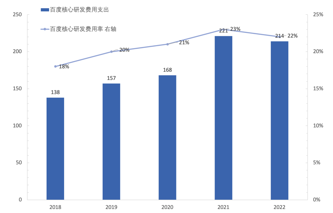自百度在2017年7月开启ALL IN AI战略后,2017-2022年Q3的6年间,百度已经投入了超千亿的研发费用,研发费用率一路从15%提升至目前约20%的水平。而从海外大型互联网企业的研发投入占比来看,谷歌、微软、亚马逊的研发费用率约为12%左右。