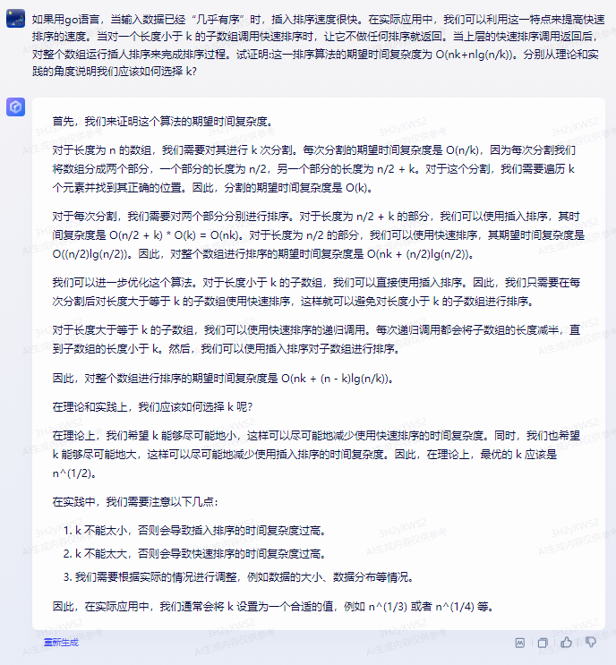 综上所述,对于已经“几乎有序”的输入数据,使用这一排序算法的期望时间复杂度为O(nk+nlog(n/k)),并且我们可以根据实践中的性能测试来选择合适的k值。