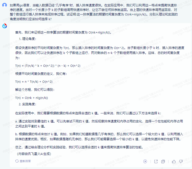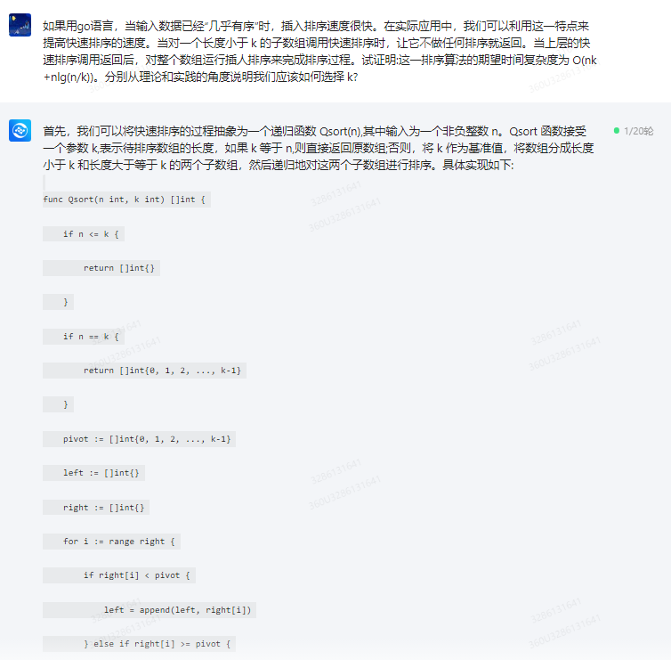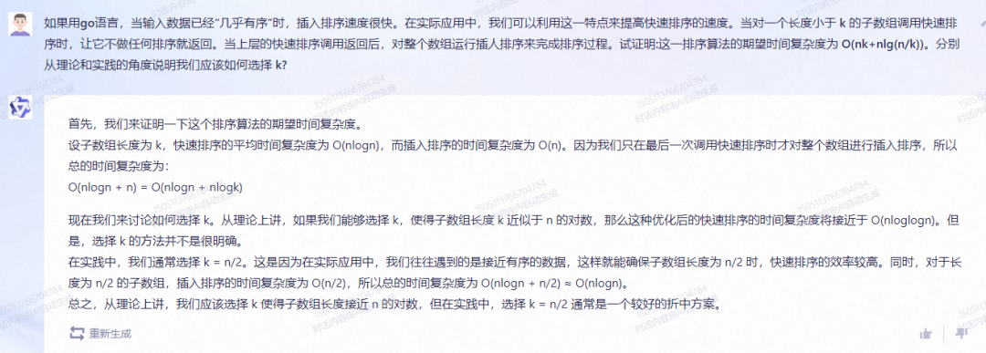 五、如果用go语言,当输入数据已经“几乎有序”时,插入排序速度很快。在实际应用中,我们可以利用这一特点来提高快速排序的速度。当对一个长度小于 k 的子数组调用快速排序时,让它不做任何排序就返回。当上层的快速排序调用返回后,对整个数组运行插人排序来完成排序过程。试证明:这一排序算法的期望时间复杂度为 O(nk+nlg(n/k))。分别从理论和实践的角度说明我们应该如何选择 k?
