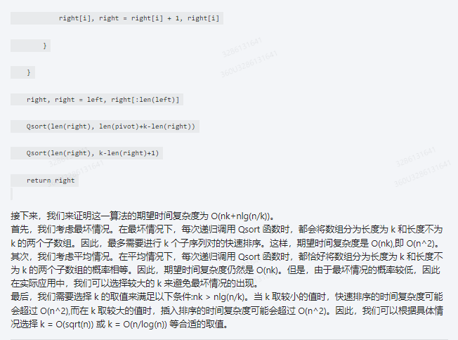 其次,我们考虑平均情况。在平均情况下,每次递归调用 Qsort 函数时,都恰好将数组分为长度为 k 和长度不为 k 的两个子数组的概率相等。因此,期望时间复杂度仍然是 O(nk)。但是,由于最坏情况的概率较低,因此在实际应用中,我们可以选择较大的 k 来避免最坏情况的出现。