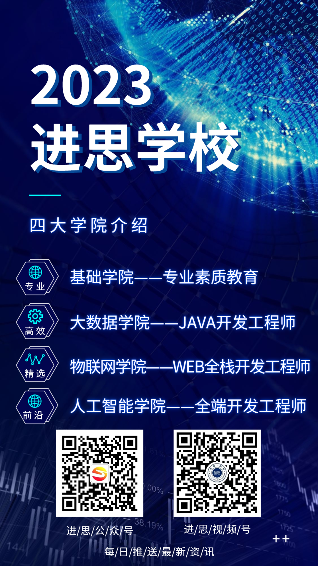 进思自办学以来,致力于互联网技术人才的培养,紧跟市场前沿,站在时代风口,在深入调研社会需求、企业需求的基础上开设互联网相关专业,进而设置具体课程,并将企业真正需要的技术知识融入课堂教学。