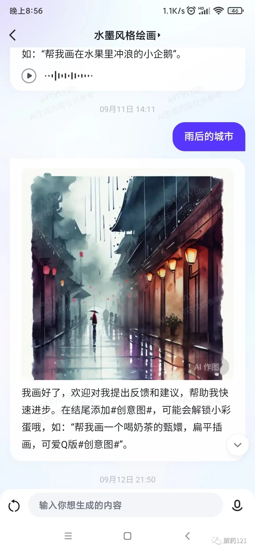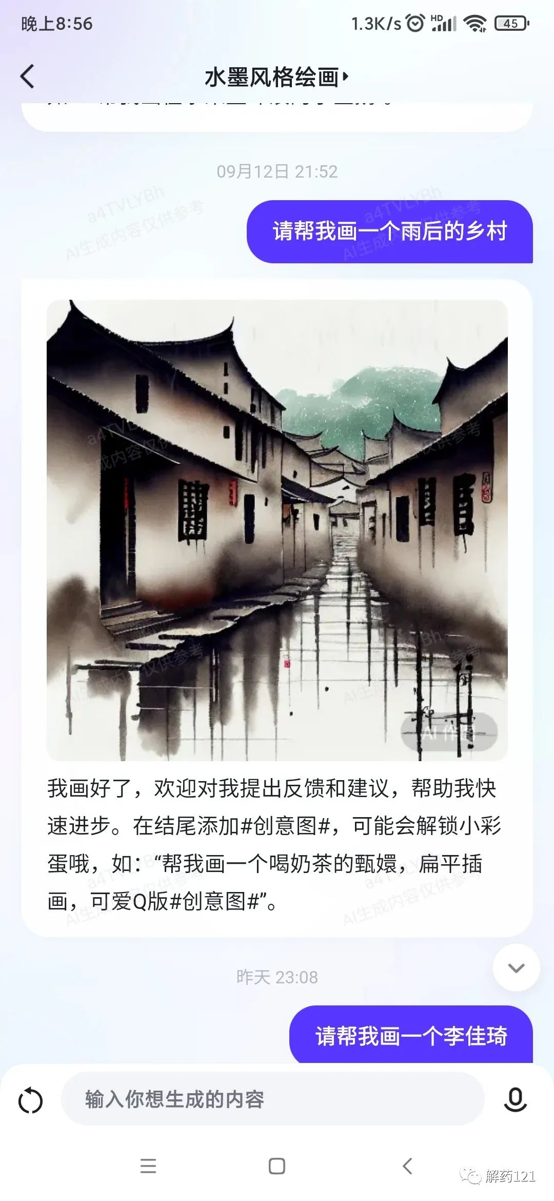 在前两幅画作中,AI展示了出色的创意和绘画技巧,仅用了数秒钟便完成了画作,其质量甚至超过了预期要求。然而,这些画作却未能完全达到水墨画的审美标准,它们显得略显粗糙,缺少了传统水墨画所特有的意境和韵味。