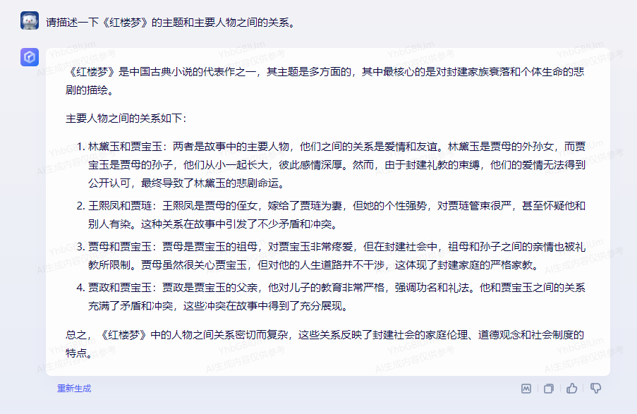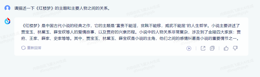 从文学创作领域来看文心一言和讯飞星火都给出了正确的答案,但是整体而言,文心一言的回答相对来说更全面,讯飞星火就相对回答得比较宽泛。