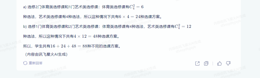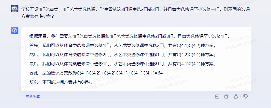提问:学校开设4门体育类、4门艺术类选修课,学生需从这8门课中选2门或3门,并目每类选修课至少选修一门,则不同的选课方案共有多少种?