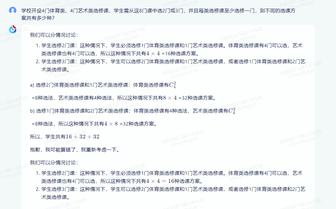 本题为2023年高考数学全国一卷真题,我们看下二者给出的答案,明显的不同,文心一言给出的是正确答案,而讯飞星火在运算过程中虽然还说了一句“抱歉,我可能算错了,我重新考虑一下”这样的字眼,但最后的结果依然是错误的。
