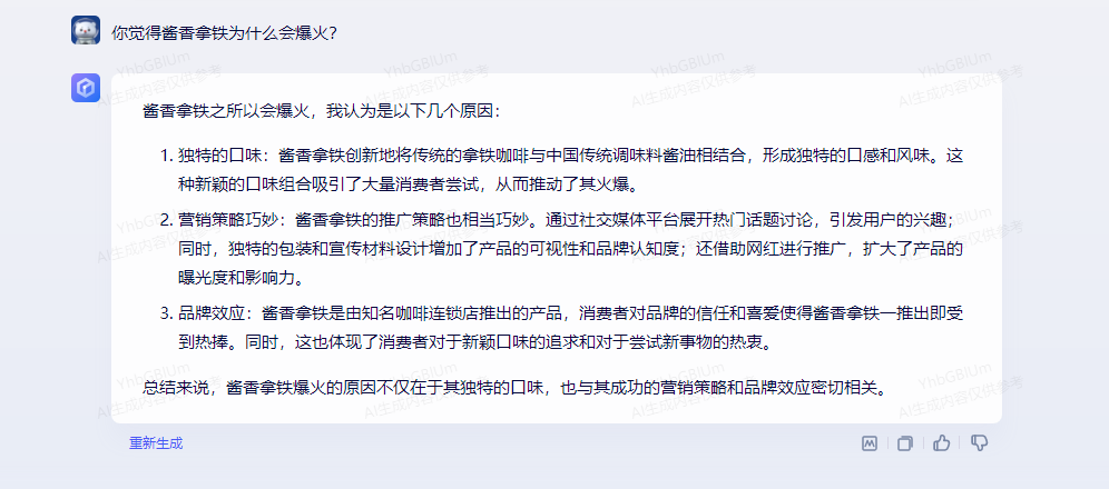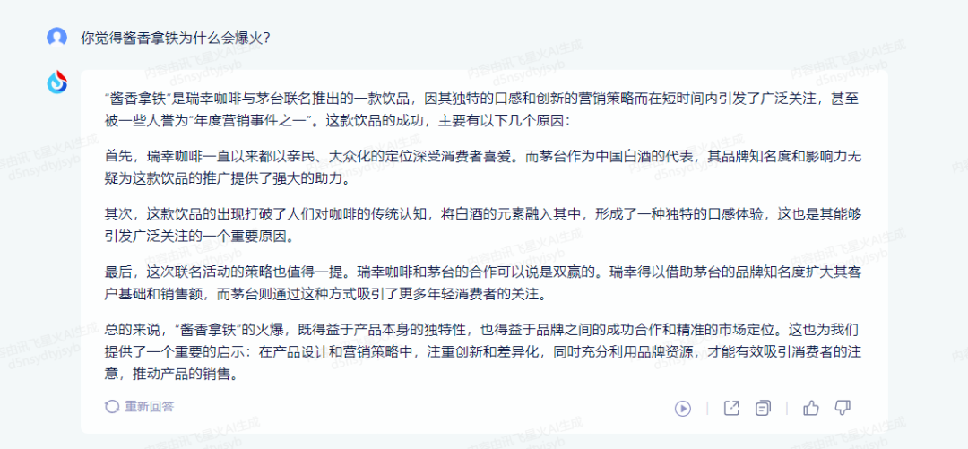 从热点事件分析来说,最近“酱香拿铁”爆火,所以就以这个话题来测试了一下,文心一言没真正理解“酱香拿铁”,而讯飞星火则非常准确地说出了是瑞幸和茅台的联名,所以说,在热点事件的分析上,讯飞星火更胜一筹。