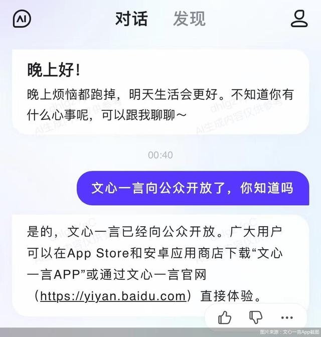 8月31日凌晨,百度文心一言宣布,将率先向全社会全面开放。用户可以在应用商店下载“文心一言App”或登录“文心一言官网”体验。3月16日,文心一言开启邀测,首批用户可通过邀请测试码,在文心一言官网体验产品,7月初百度上线了文心一言苹果版App,用户依然需要获得内测资格才能体验到各种AIGC(人工智能生成内容)功能。