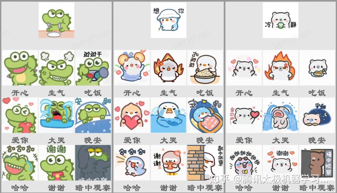 下面是一些生成的表情包的效果(最上面为原始表情,下面的都是生成出来的表情):