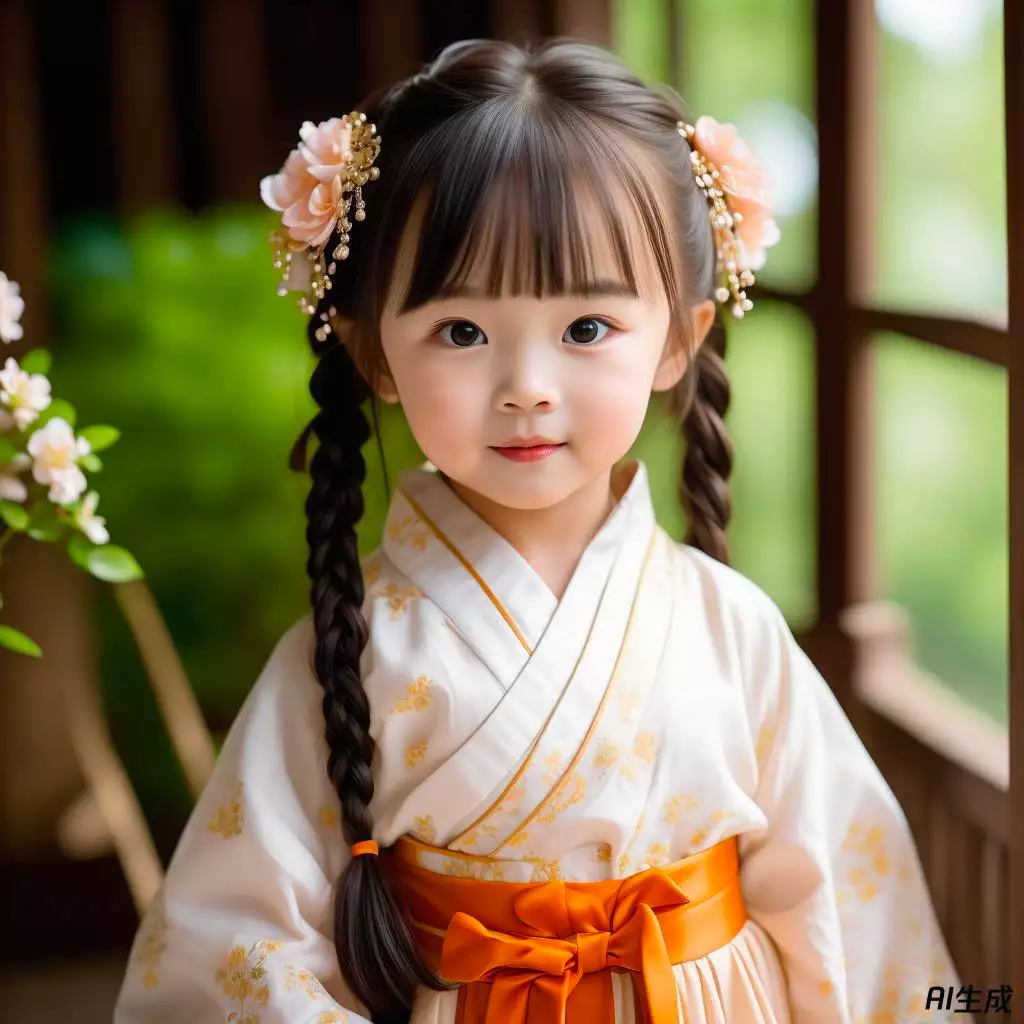 在业界公认难度较高的人脸画像生成上,腾讯混元也交出了令人满意的作品。比如,输入提示词“生成可爱的亚洲 4 岁女孩穿着棉质连衣裙,大眼睛,古代中国,摄影风格,汉服”,腾讯混元大模型生成如下:
