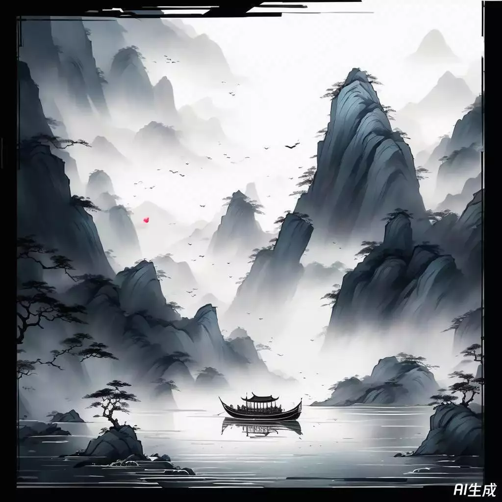 更简单一些,输入提示词“轻舟已过万重山,水墨画风格”就可以得到下面的图片: