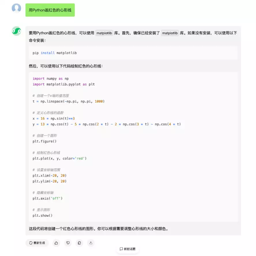 只需输入简单的指令如“帮我用前端语言实现一个贪吃蛇”,腾讯混元便能自动生成可运行的代码,快速制作出一个贪吃蛇小游戏。此外,腾讯混元还支持Python、C++、Java、Javascript等多种语言的指令生成,比如输入“用Python画红色的心形线”,腾讯混元会提供代码库选择、安装命令、绘制代码等具体操作步骤的指引。