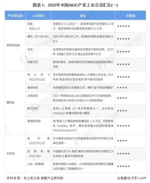 根据研究机构前瞻产业研究院的报告,当前,我国的AIGC产业已涌入了互联网大厂、AI公司、生态场景链公司、研究机构等多类参与者。在产业链的三个层级上的主要企业分别是:基础设施层主要有百度、腾讯、华为、阿里巴巴等;模型层主要有百度、腾讯、科大讯飞、华为、阿里巴巴、澜舟科技、必优科技、联汇科技、智源研究院、达摩院等;而应用层主要有万兴科技、拓尔思、创新奇智、美图等。另外,还包括独角兽与新兴创业公司小冰、超参数、澜舟科技、必优科技、智谱华章、密度科技、西湖心辰、联汇科技、蜜度科技、影谱科技、出门问问、云舶科技、聚力维度、启元世界、诗云科技等。
