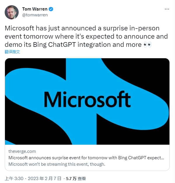🎉微软动作大!2月7日即将震撼登场💥据透露,这家科技巨头将在即将到来的发布会上,揭秘其备受瞩目的ChatGPT与Bing融合计划,同时深化与OpenAI的战略合作。尽管官方对具体内容保持神秘,但这场盛会无疑将为人工智能领域带来一股强劲冲击波,让我们拭目以待微软如何引领搜索新潮流!💡